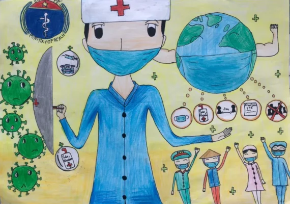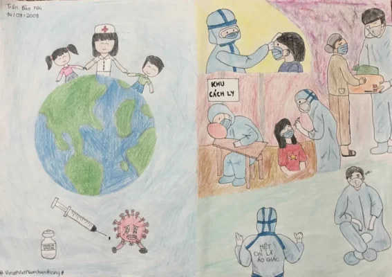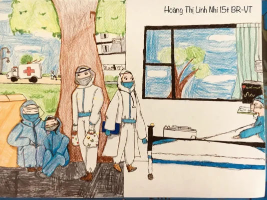 Tranh của em Hoàng Thị Linh Nhi gửi về chương trình. Trong tranh, các y bác sĩ không quản khó khăn, dù có lúc kiệt sức, nhưng vẫn quyết tâm bảo vệ tính mạng cho bệnh nhân COVID-19