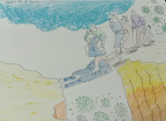 Hình ảnh một y bác sĩ lấy thân làm cây cầu nối, để kịp thời đưa người mắc bệnh đi điều trị kịp thời, tránh xa virus SARS-CoV-2 cũng được em Nguyễn Thị H. Thương thể hiện ấn tượng